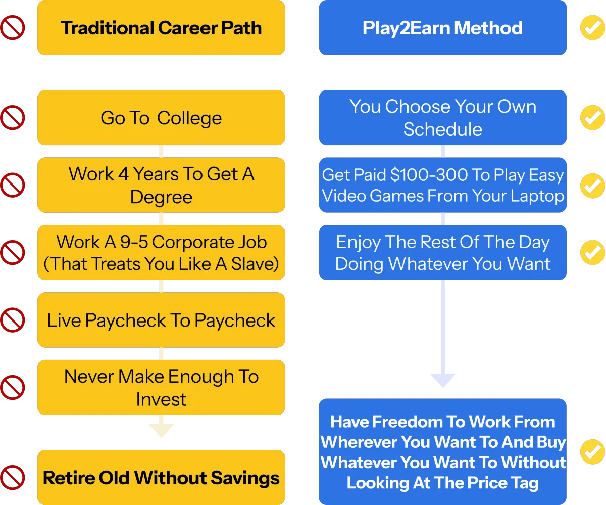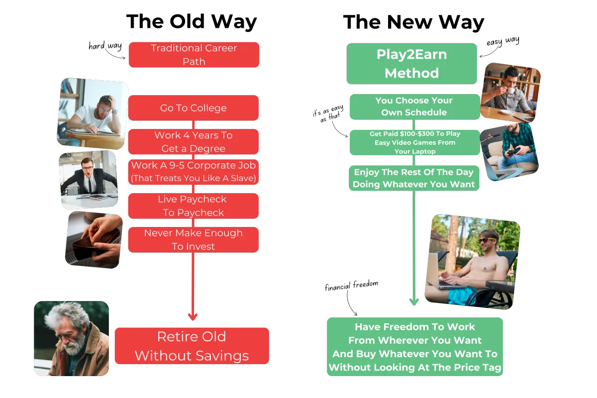Unlike traditional careers that may require a college degree, long hours in a 9-5 job, and living paycheck to paycheck, Play2Earn Method offers a potential to earn substantial income through a few hours of gaming, providing more freedom and financial independence.